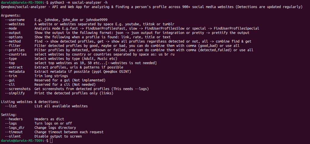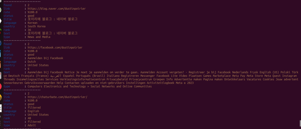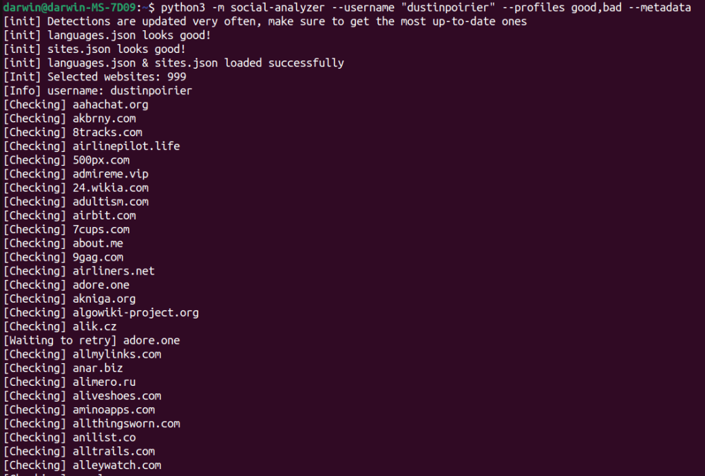 python3 -m social-analyzer –username “dustinpoirier” –profiles good,bad –metadata