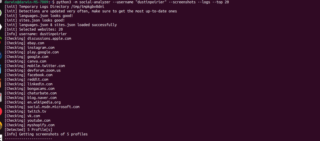 python3 -m social-analyzer –username “dustinpoirier” –screenshots –logs –top 20