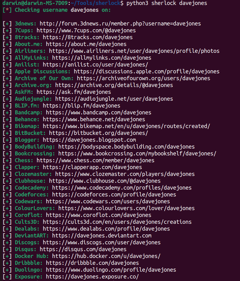 Another OSINT tool i will share today is Sherlock. Similar to Social-Analyzer, but a much tidier display.