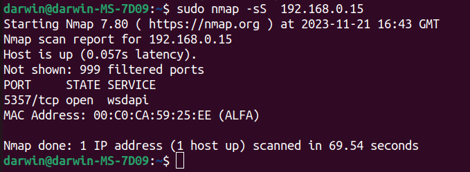 sudo nmap 192.168.0.15 -sS -oN mytestscan.txt