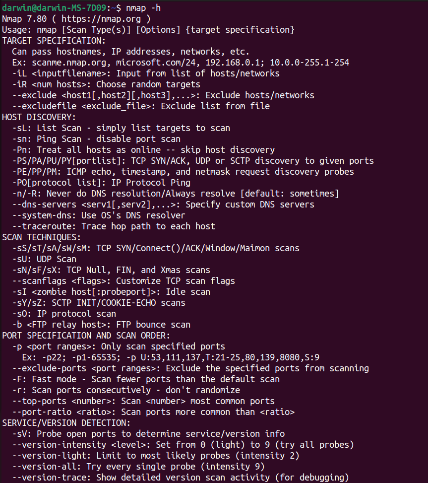 This command will show you the help menu. Going to https://nmap.org/book/man.html will give you more details about the specific tags and what they do.