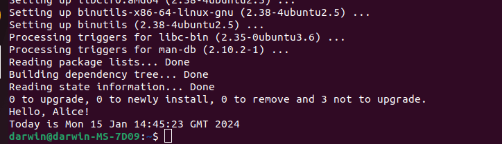 This will print “Hello, Alice!” to the standard output. You can also use variables to store the output of commands, using the $( ) syntax. For example: