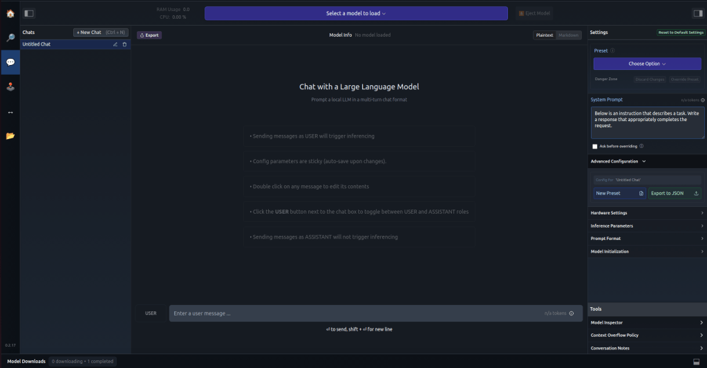 Go to the top where it says “select a model to load” and pick the one you downloaded. You are then ready to chat to the LLM.