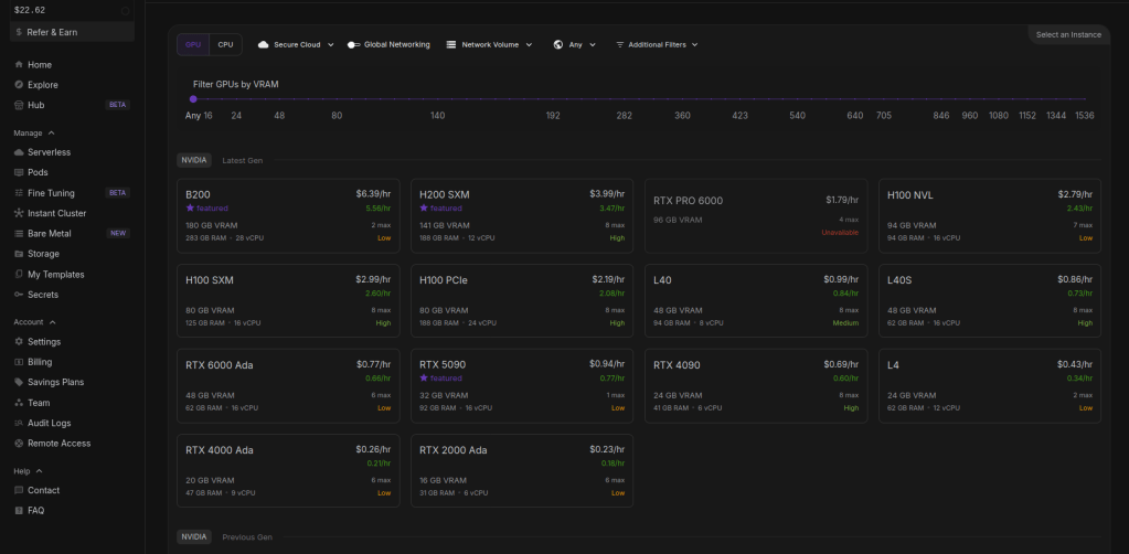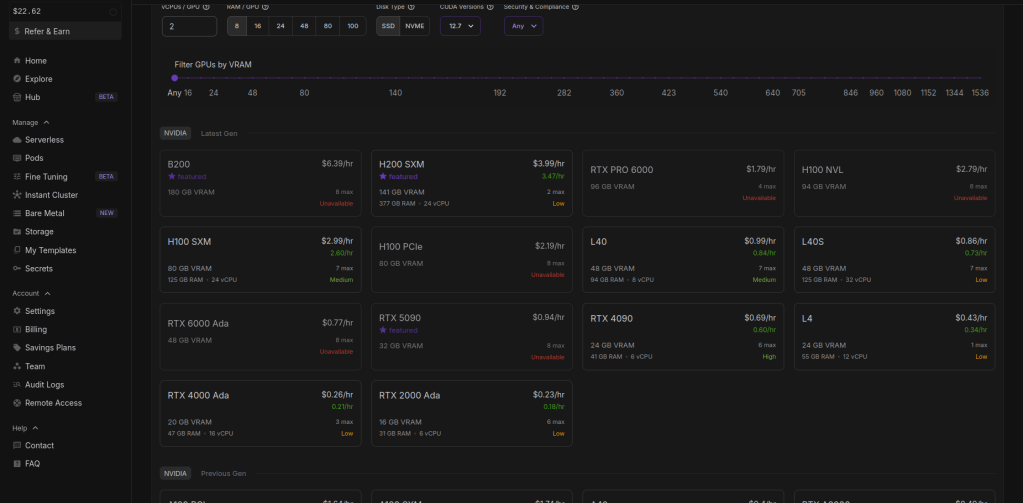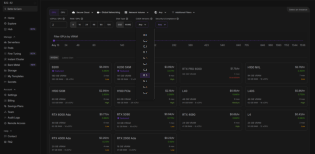 So on the pods page i change the cuda version to 12.6 or above in order for the wan pod we will use to work. You can change the cuda version to see what pods are available, sometimes there is no cheaper ones avalaible when you pick 12.6 version. I will go with the RTX 4090.