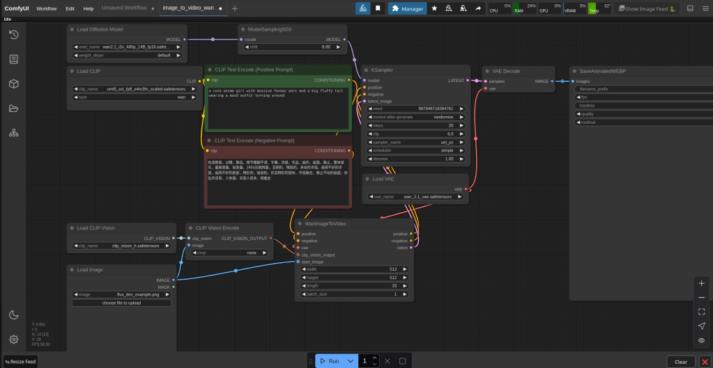 This is the default set up. Change the load difussion model option to on the fly wan. Load clip to umt5_xxl_fp16.safetensors. Steps to 30, cfg 7.0. If you got a picture from stable diffusion and followed the instructions from that, width and height will be 832 – 1216. Length is seconds in video, 81 is about 4 seconds. When using this i went to 121 it crashed you would probably need a more powerful machine to go further then 121.