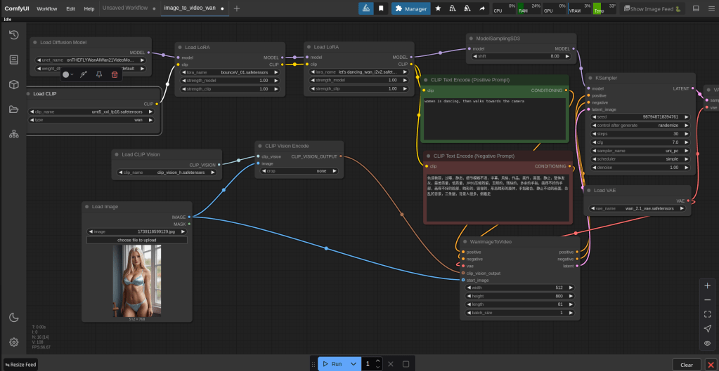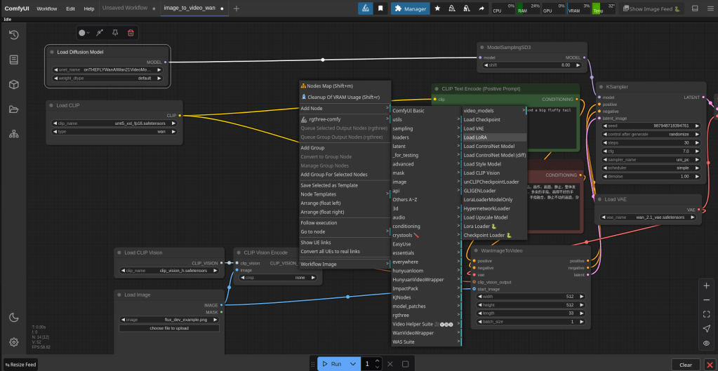 Above is how you add the lora boxes. You can switch between different lora models you have uploaded. The loras will help your description and make your video come out how you want it to. Depending on your width, height and length this process can take up to 20min-1h. If you pay for a more expensive pod it is possible that this will speed things up, although i have not tried this myself. In the bottom left is where you upload your picture.