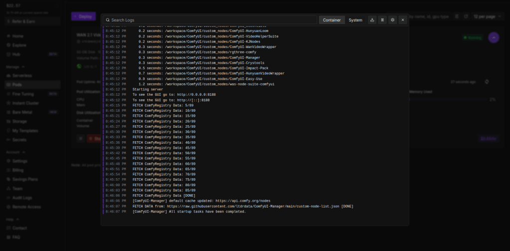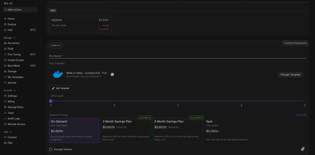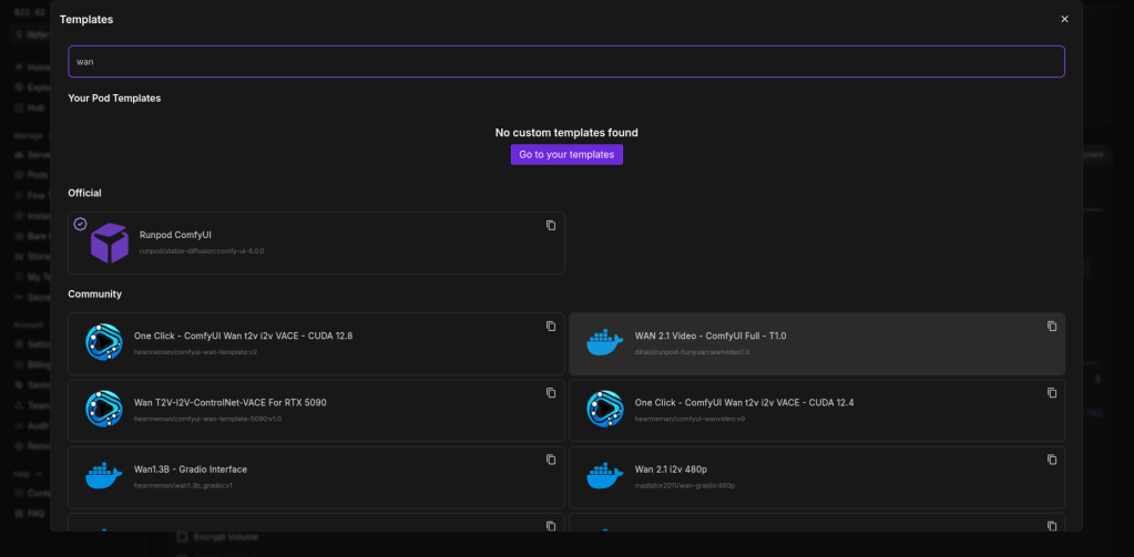 So here i will go into wan 2.1. The first part is the same as setting up flux, same pod , cuda 12.6 or above, but the files we upload will be different and the option we pick when loading comfy.